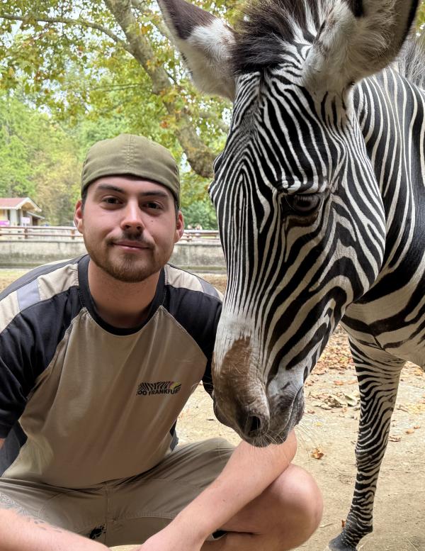Dennis Fleischer hat 2022 seine Tierpflegerausbildung im Frankfurter Zoo abgeschlossen und arbeitet seitdem im Huftierrevier. Neben den Grevyzebras gehören hier die Bongos, Okapis und Pinselohrschweine zu seinen absoluten Favoriten.