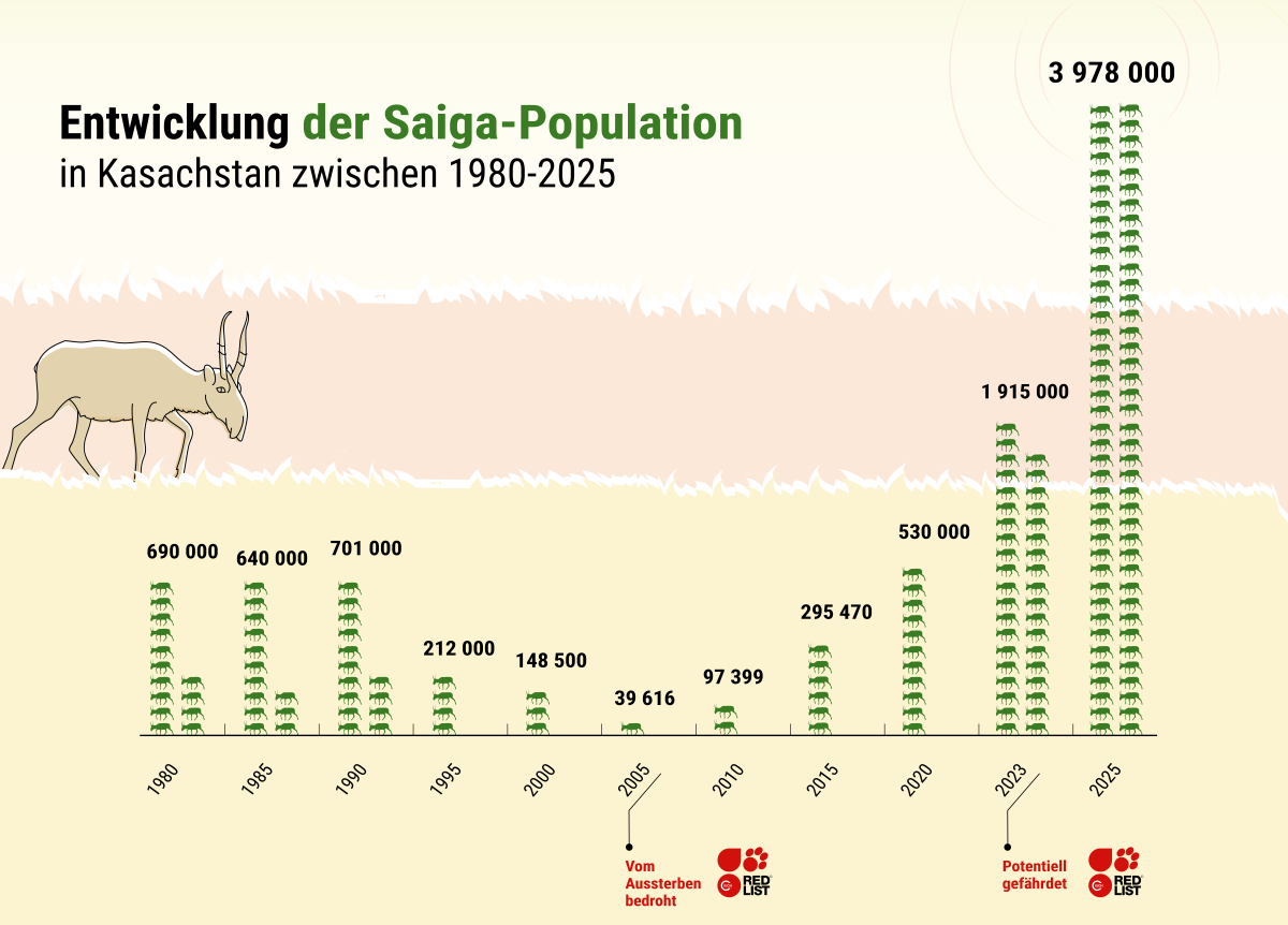 Denn zuvor war die Zahl der Saigas innerhalb von nur zehn Jahren um mehr als 95 % auf 21.000 Tiere im Jahr 2003 gesunken – der schnellste Rückgang, der jemals bei einer großen Säugetierart verzeichnet wurde. Ebenso historisch war ihre Erholung, nachdem Naturschutzmaßnahmen eingeleitet wurden: Heute leben in Kasachstan mehr als 3 Millionen dieser besonderen Antilopen, und ihr Schutzstatus wurde von „vom Aussterben bedroht“ auf „potenziell gefährdet“ herabgestuft.